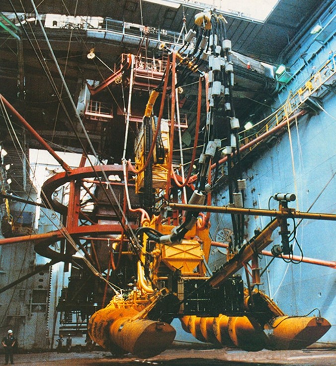 Collector vehicle used for OMCO trial. Twin two meter-diameter Archemedes screws were used to propel the vehicle and in between these was a collector head designed to pick up nodules from the seafloor.